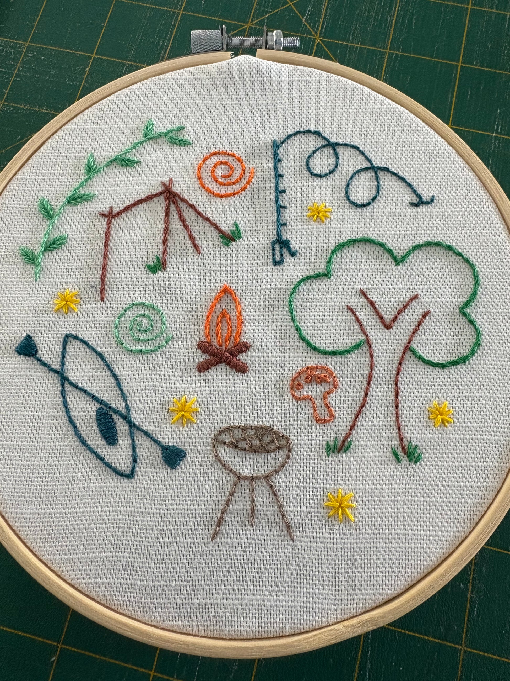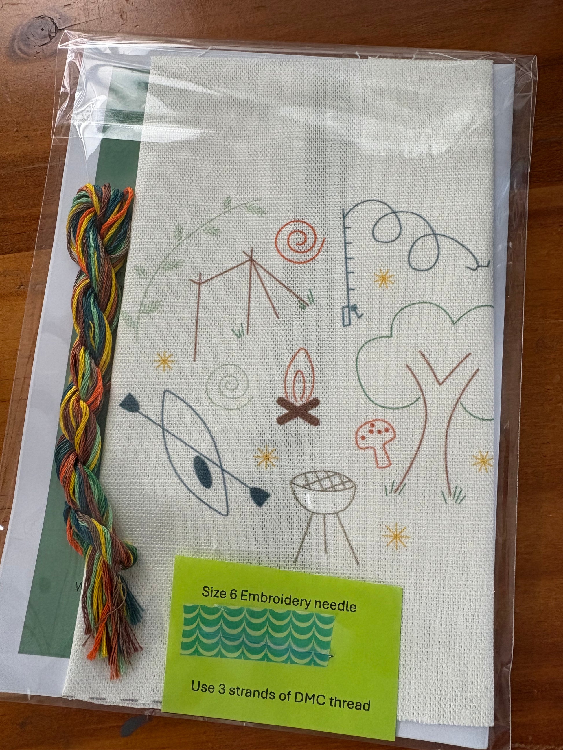 Camping Trip embroidery kit, preprinted in colour on a cotton and linen blend fabric. All threads and needle included as well as easy to follow instructions. The design size 13cm x 11cm