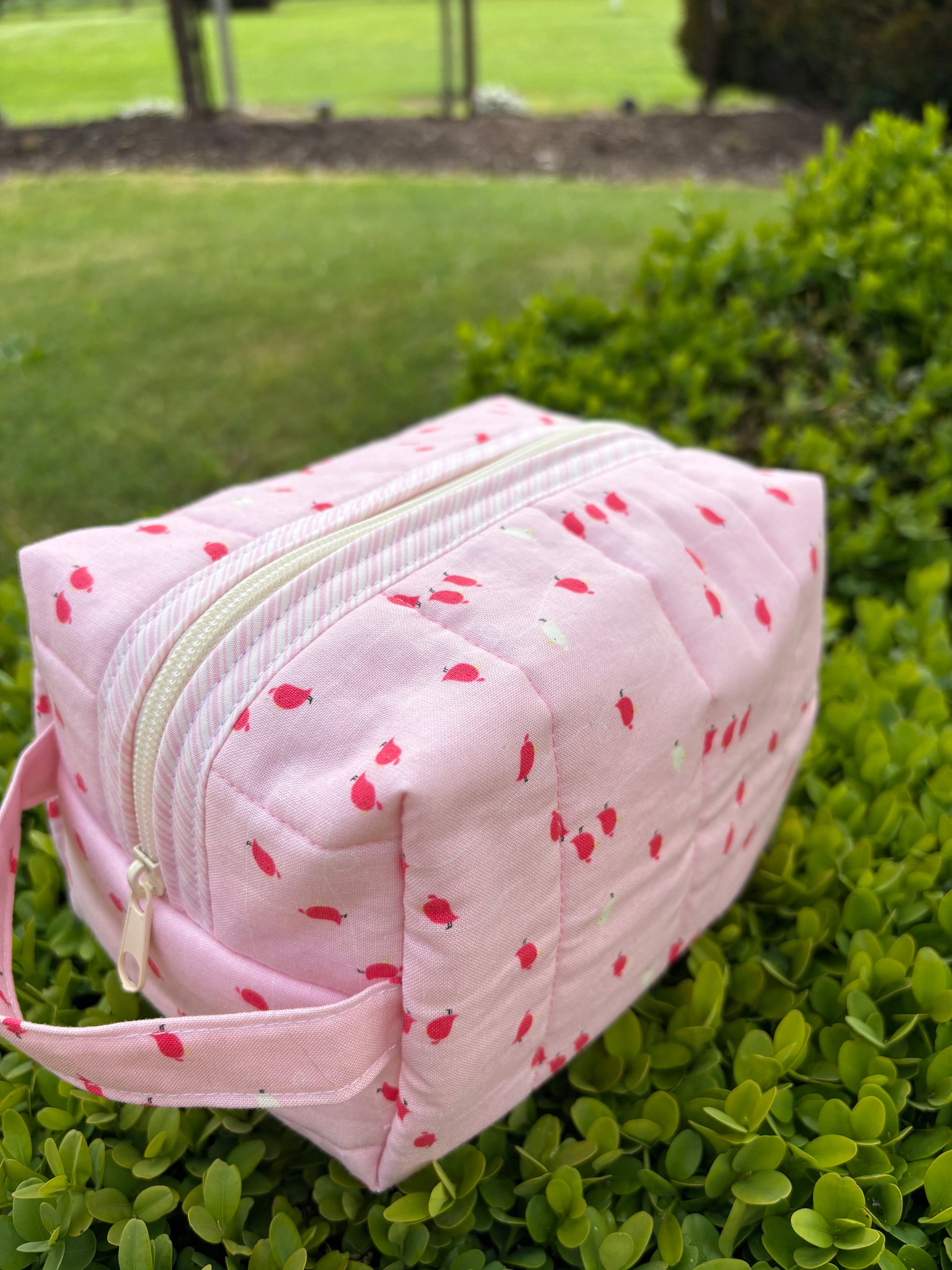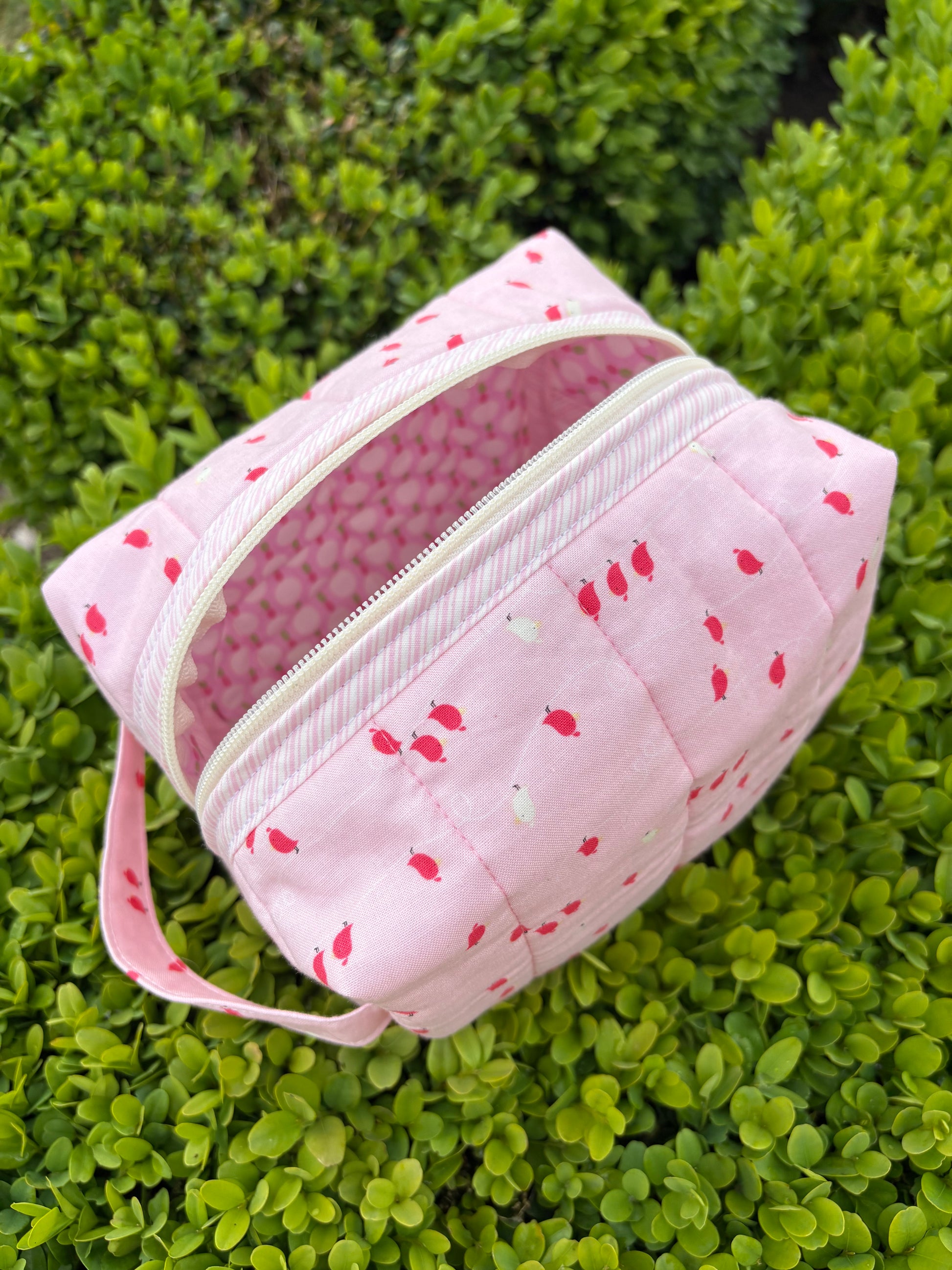 The little birdie box pouch is made from 100% cotton and has a medium weight pellon to give it shape. The bag is 19 cm long 15 cm wide and 12 cm high