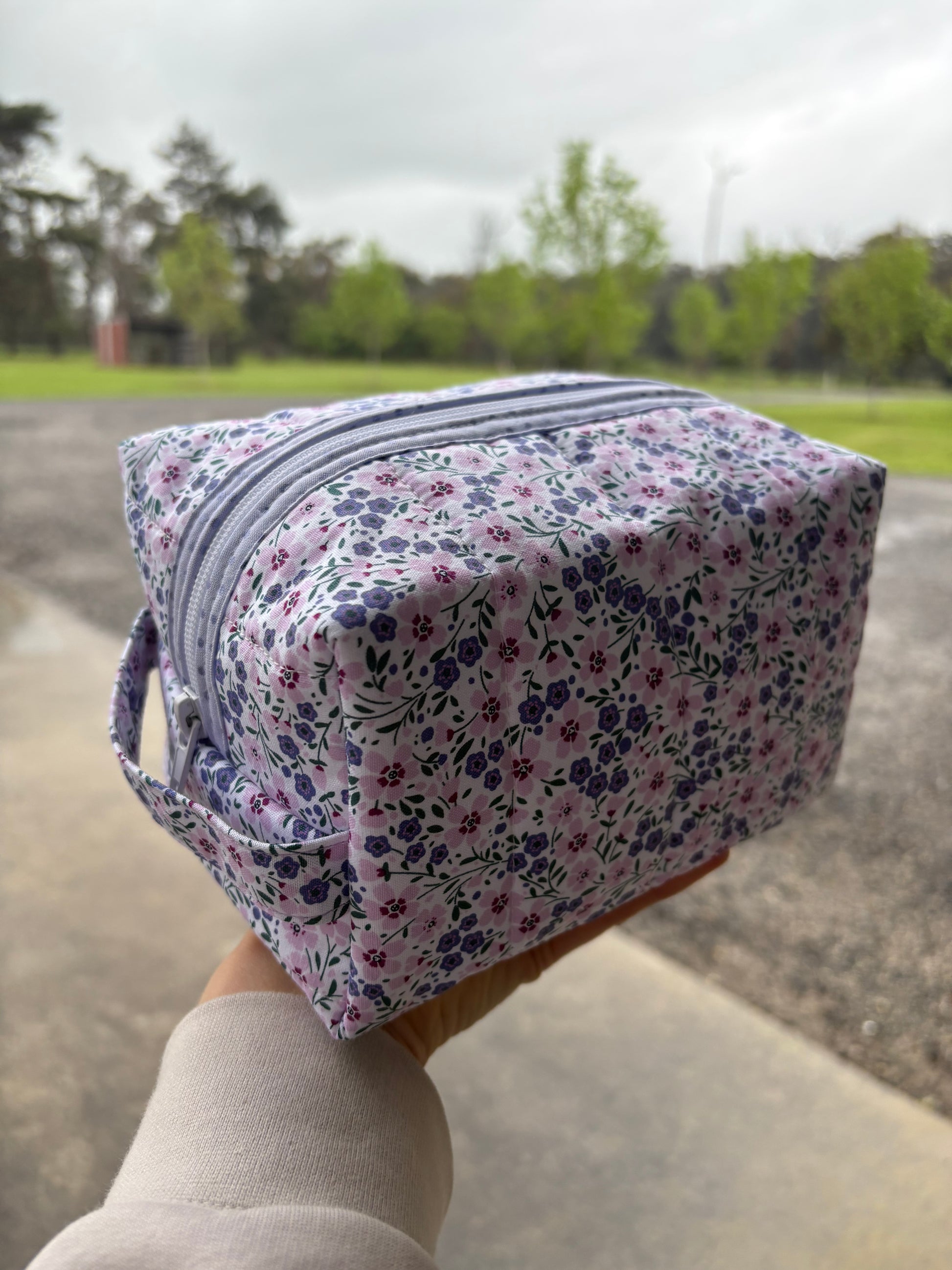 Little dreamer box pouch is made from 100% cotton and has a medium weight pellon to give its shape. The pouch is 19cm long, 14cm wide and 11cm high. It has a little carry handle too.