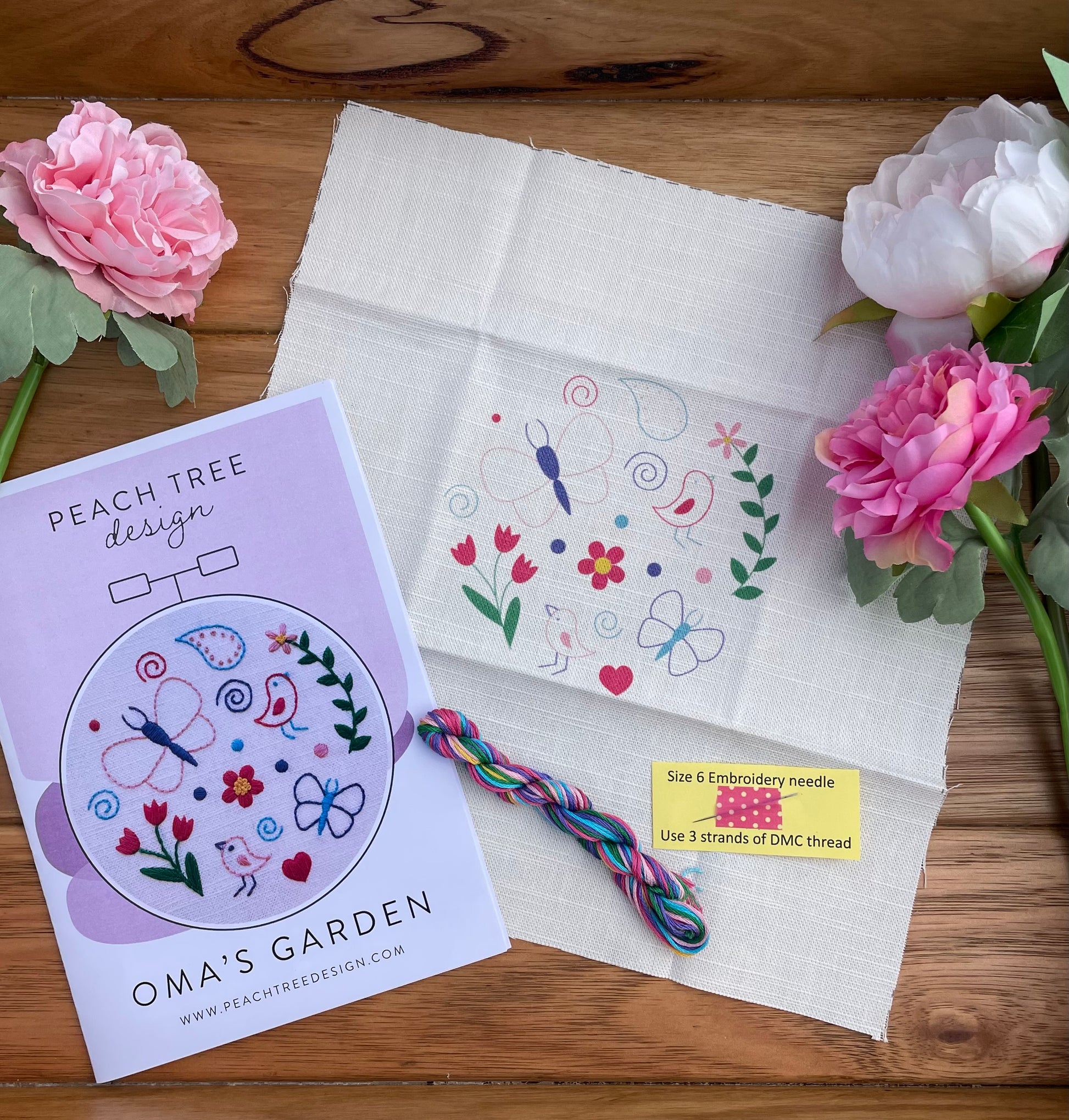 Oma’s Garden embroidery kit is preprinted in colour on a Cotton and linen blend fabric. The it comes with all the thread and needle as well as easy to follow instructions. The design size measures 13 cm x 13 cm