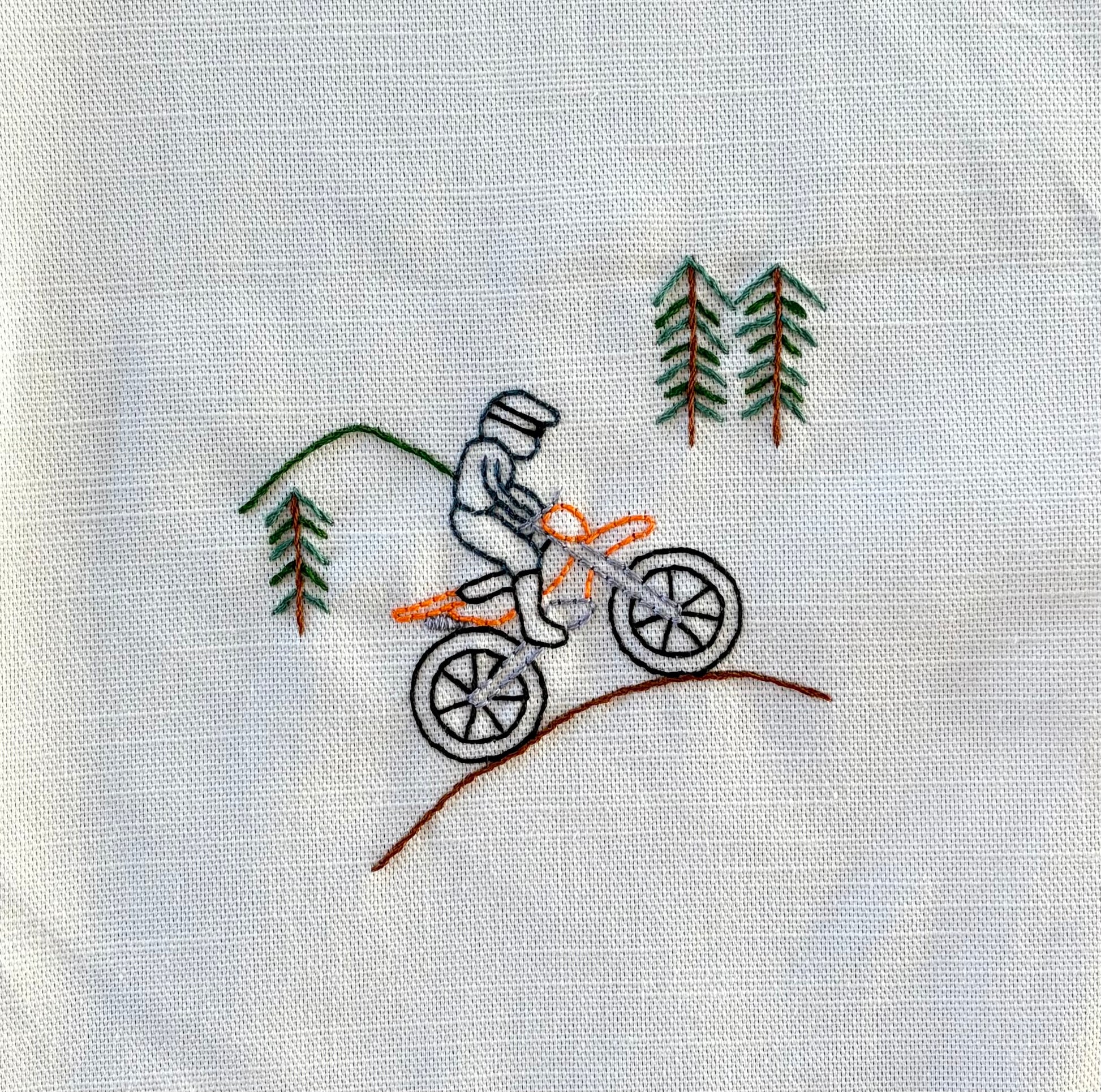 Ride Day embroidery kit is preprinted in colour on a Cotton and linen blend fabric. The it comes with all the thread and needle as well as easy to follow instructions. The design size measures 12 cm x 12 cm