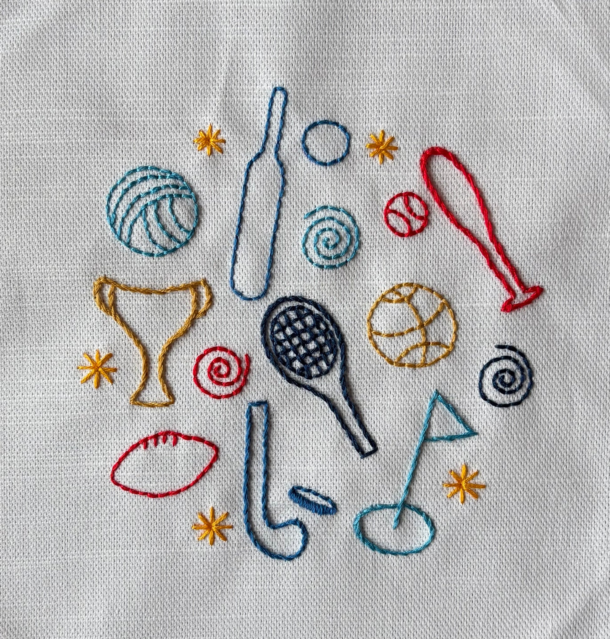 Sports Day embroidery kit is preprinted in colour on a Cotton and linen blend fabric. The it comes with all the thread and needle as well as easy to follow instructions. The design size measures 13 cm x 14 cm